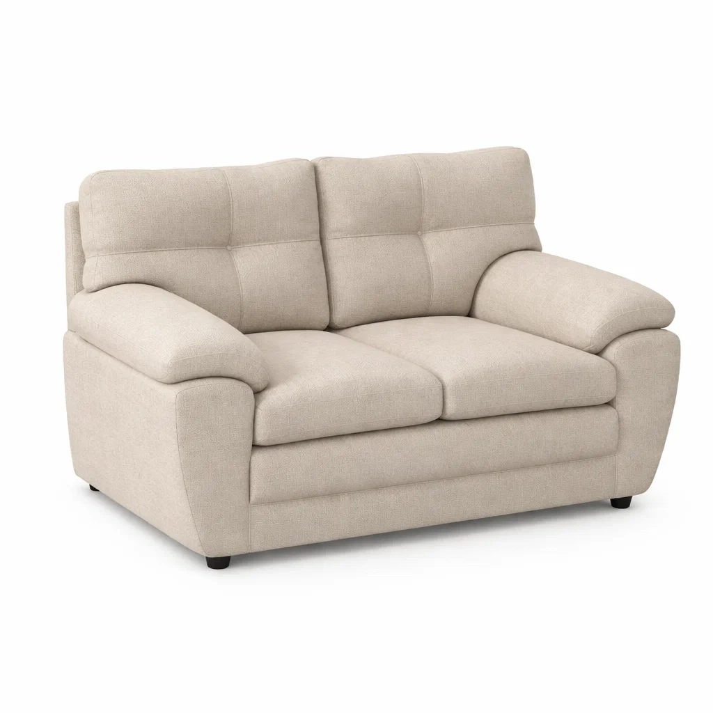 Le canapé 2 places est fabriqué avec une structure en bois massif et contreplaqué. Le revêtement est en polyester résistant et de couleur beige.