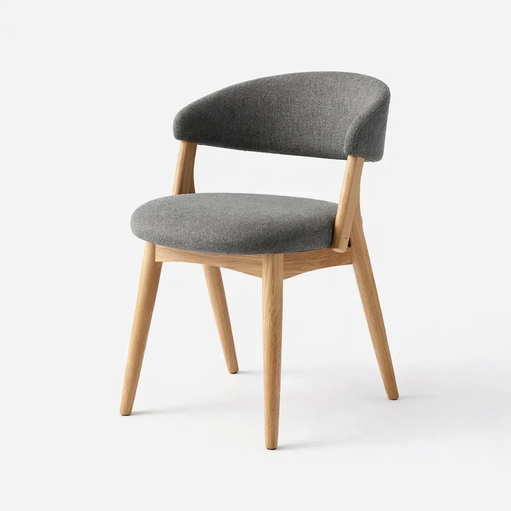Chaise composée d'une assise en tissu de polyester gris et d'une structure en chêne. Dimensions : Hauteur 80 cm, Largeur 52 cm, Profondeur 48 cm. Poids du produit : 5 kg. Capacité de charge : 100 kg.