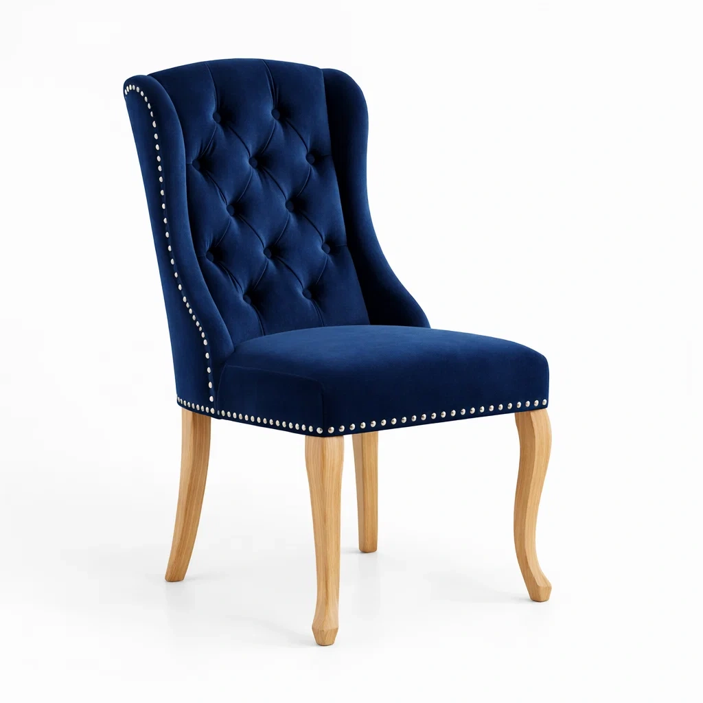 Chaise en velours avec structure durable en bois de chêne. Dimensions : hauteur 105 cm, largeur 50 cm, profondeur 45 cm. Le dossier est capitonné et orné de clous décoratifs.