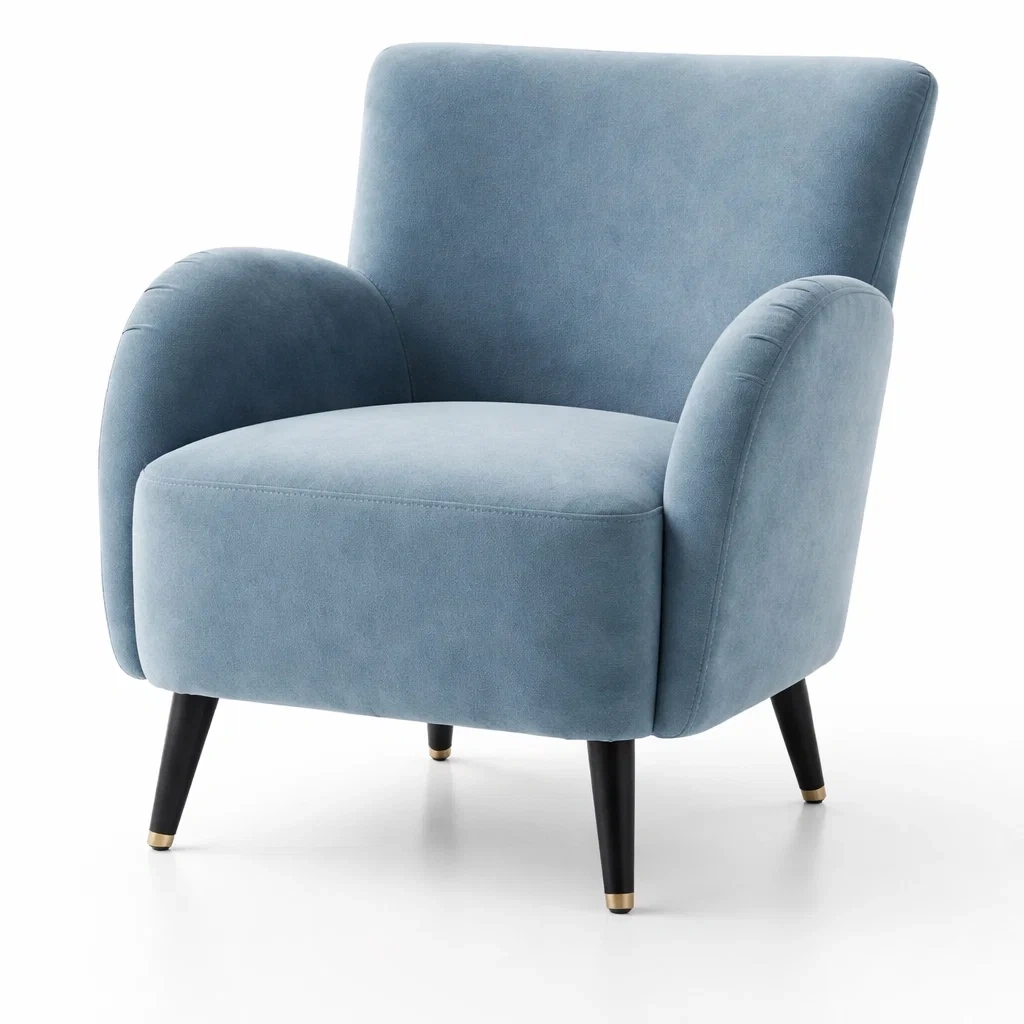 Ce fauteuil est équipé d'une structure robuste en bois massif et est recouvert d'un tissu en velours.