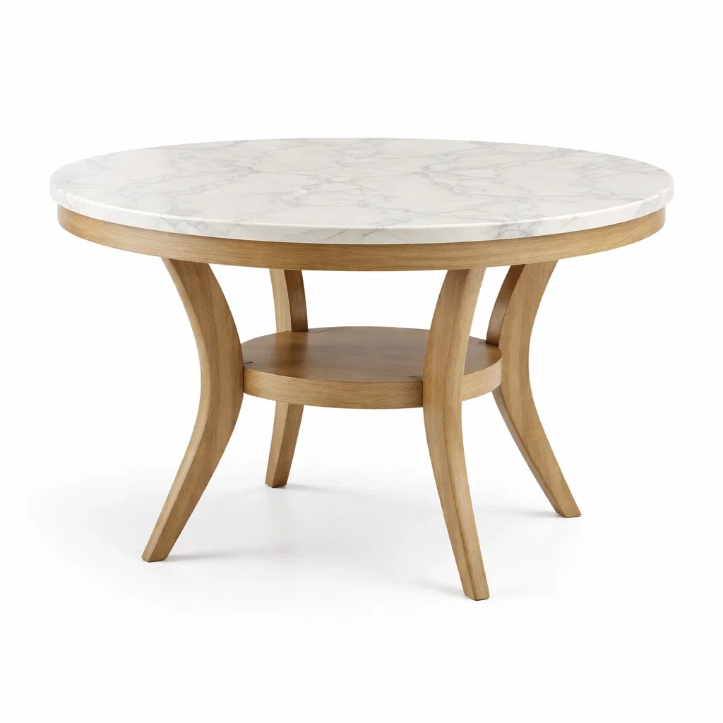 Matériaux: Plateau en marbre blanc, structure en bois d'hévéa massif