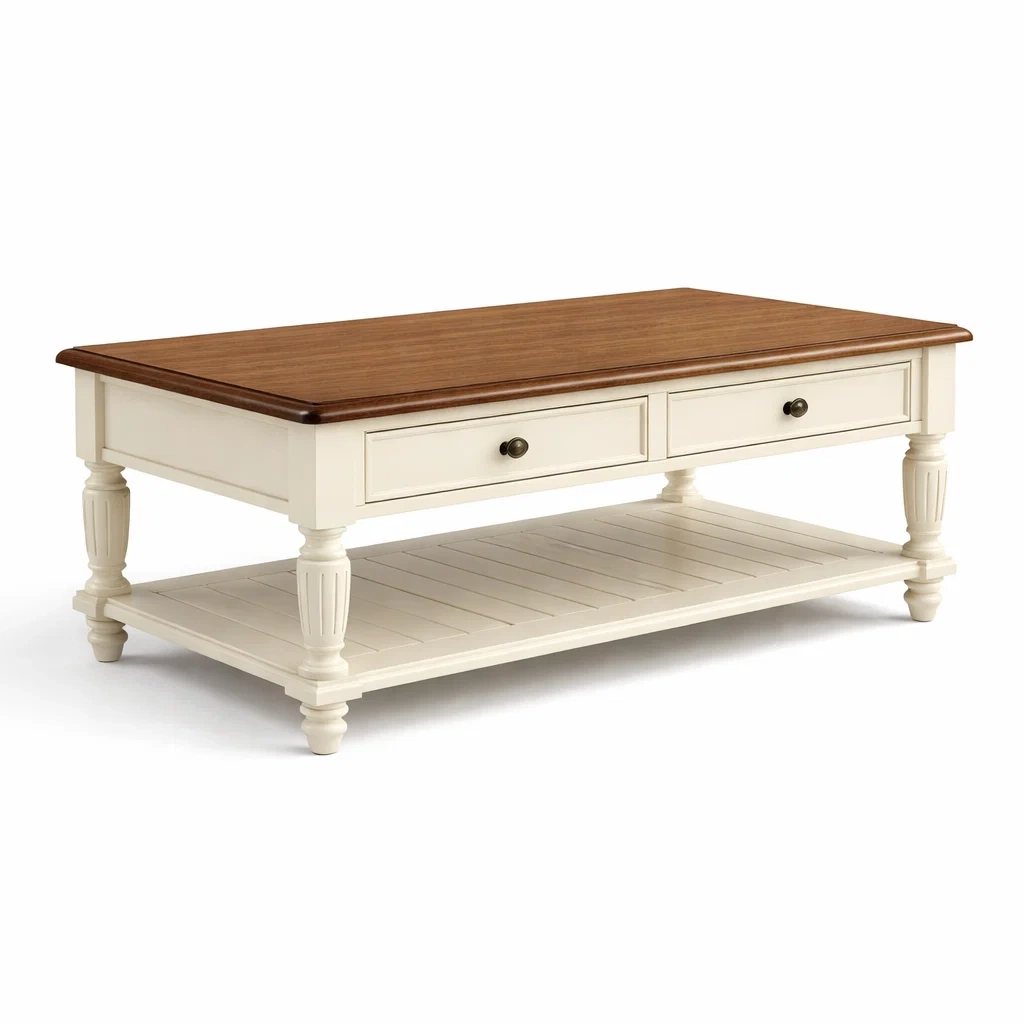 La table basse est fabriquée avec un cadre en MDF et un plateau en bois de chêne massif. La surface est finie avec un vernis. Ses dimensions sont 120 cm de longueur, 60 cm de largeur et 45 cm de hauteur. Poids environ 15 kg. La couleur principale est Blanc avec un plateau Chêne. Elle dispose de tiroirs et d'une étagère inférieure. Entretien avec un chiffon sec recommandé. Poignées en métal.