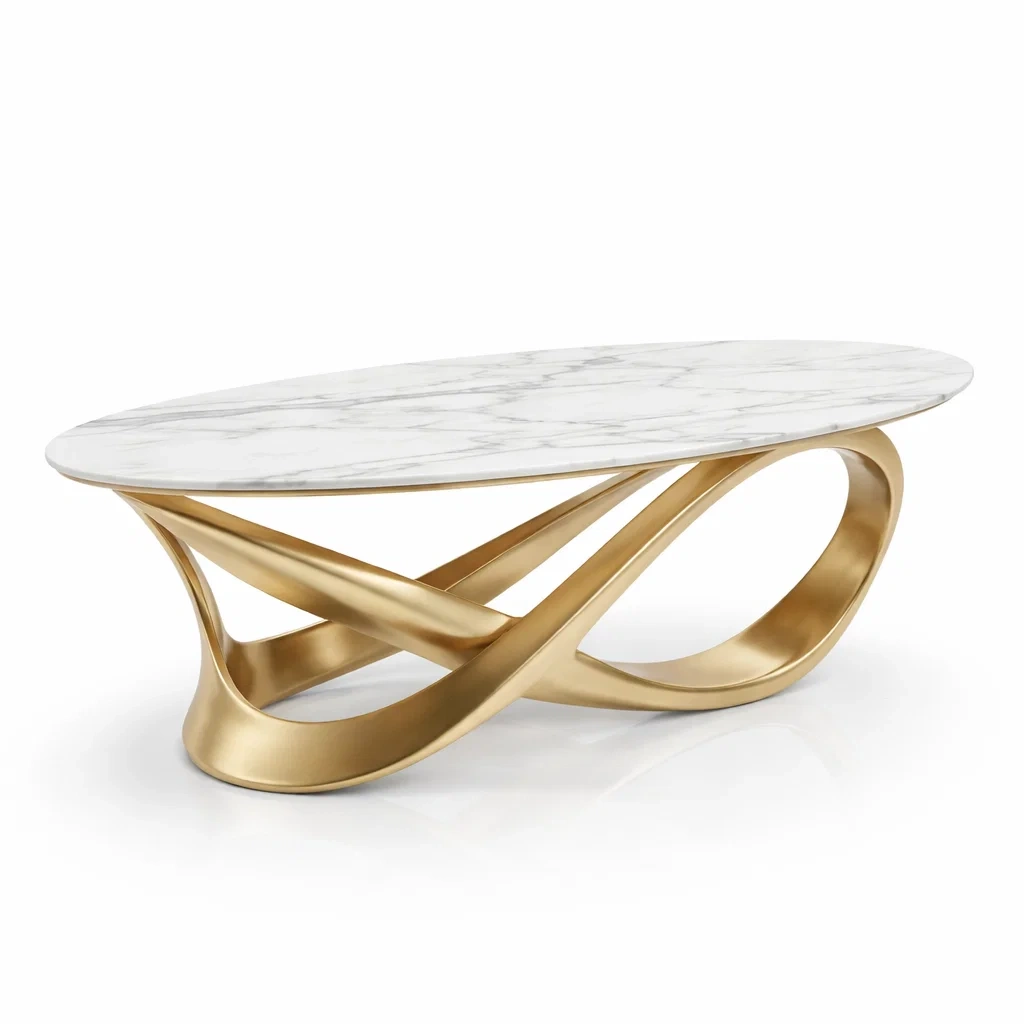 La table basse possède un plateau en marbre de Carrare et une base en métal doré.